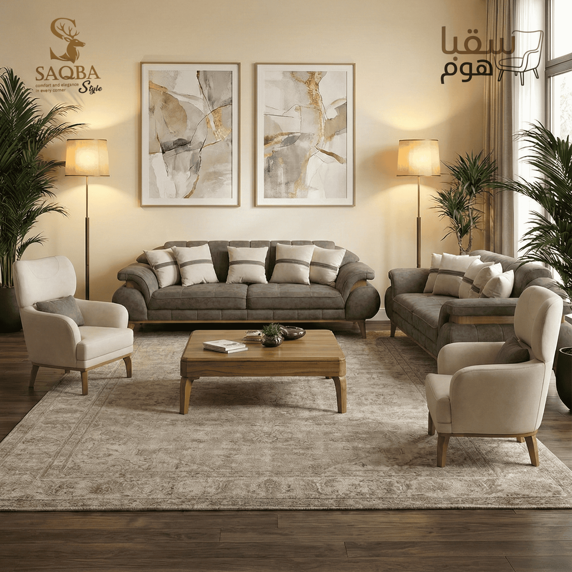 “ليس مجرد طقم جلوس، بل هو تجربة استرخاء متكاملة. مجموعة (أستيرا) تجمع بين عمق اللون الرمادي ودفء الخشب الطبيعي، لتخلق توازناً مثالياً في غرفة معيشتك. صُممت بتفاصيل هندسية دقيقة لتمنحك الراحة التي تستحقها والفخامة التي تفتخر بها أمام ضيوفك.”