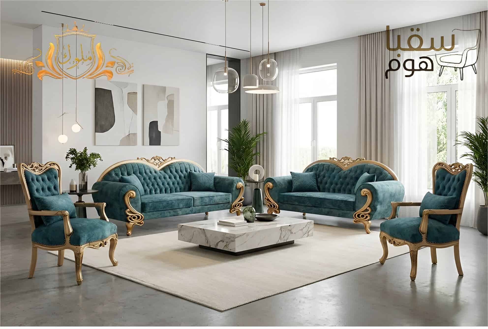 طقم الجلوس “أمبريانو” يجسد الأناقة الملكية الفاخرة بروح عصرية متجددة. يتميز بتفاصيل زخرفية متقنة وإطار ذهبي راقٍ يبرز فخامة التصميم، مع قماش مخملي ناعم بلون ملكي يضفي على المكان حضورًا فريدًا وإطلالة استثنائية. اختيار مثالي لمن يبحث عن الرقي والجمال الخالد وراحة لا تضاهى في كل ركن من أركان منزله.