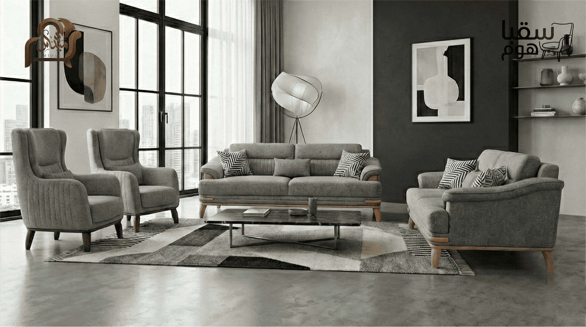 أرائك رمادية أنيقة بقماش فاخر وتصاميم خطوط نظيفة تعكس الحداثة