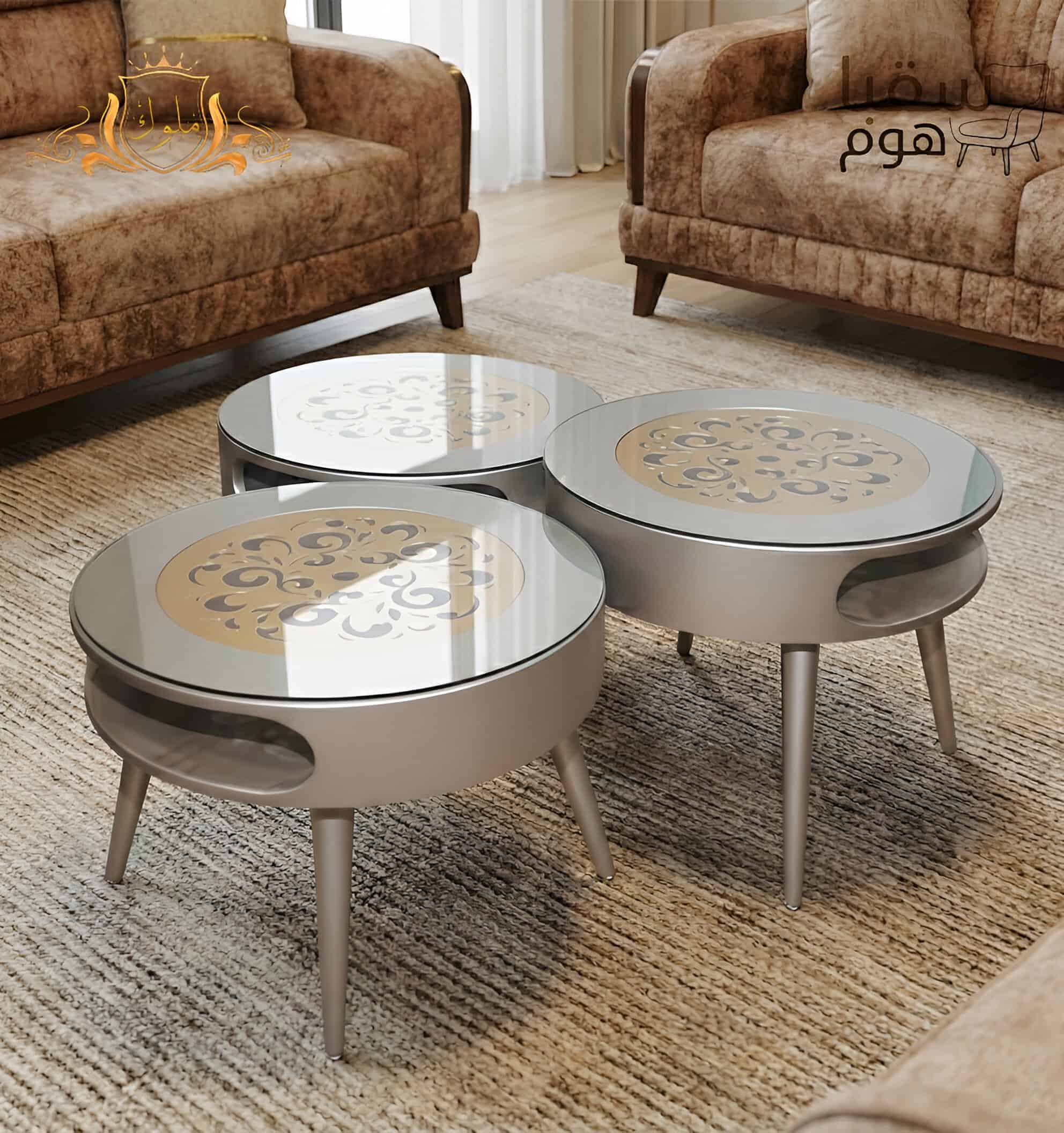 تم تصميم هذه المجموعة الفريدة من ثلاث طاولات قهوة دائرية لتكون أكثر من مجرد أثاث؛ فهي قطع فنية تجمع بين الأناقة الكلاسيكية والتصميم الحديث. يتألق سطح الزجاج الشفاف بتصميم ذهبي متقن تحته، يشبه هالة من الضوء تضفي جمالًا لا مثيل له على أي مساحة. القاعدة المعدنية الفضية ذات الأرجل الرفيعة توفر استقرارًا مثاليًا مع مظهر خفيف وعصري، بينما يوفر الرف الجانبي المنحني مساحة عملية لتخزين المجلات أو المشروبات، مما يجعلها مثالية لكل من الاستخدام اليومي والاستمتاع بالمناسبات الخاصة.