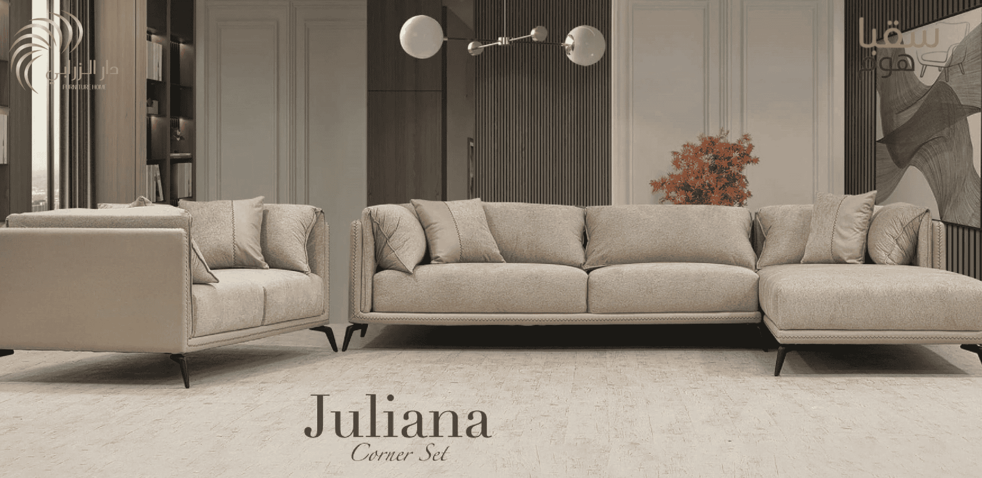 يتميز “جوليانا “ بتصميمه الأنيق والمميز، حيث يجمع بين الخطوط الكلاسيكية والمقاعد الواسعة التي تضمن لك الراحة التامة. ألوانه المحايدة الدافئة، مثل البيج الفاتح، تضفي جوًا من الدفء والأناقة على مساحتك. التفاصيل المعدنية والإكسسوارات الأنيقة تعزز من جمال هذا الطقم، مما يجعله الخيار المثالي لمن يبحثون عن توازن بين الفخامة والراحة.