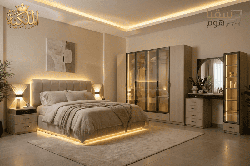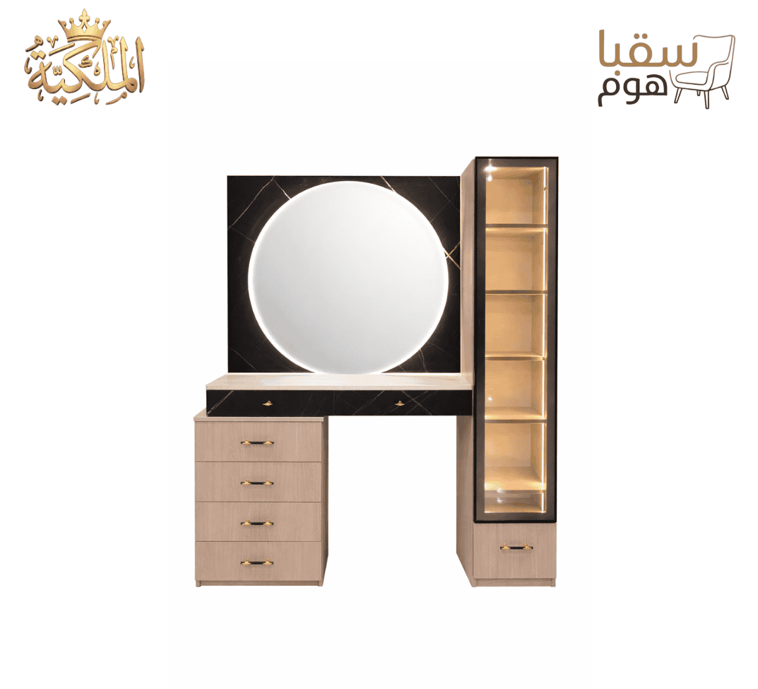 السرير بتصميم مبطن أنيق يوفر أقصى درجات الاسترخاء، بينما تضيف الخزانة الزجاجية المضيئة والتسريحة العصرية بمرآتها الدائرية لمسة عصرية جذابة وعملية في آنٍ واحد.