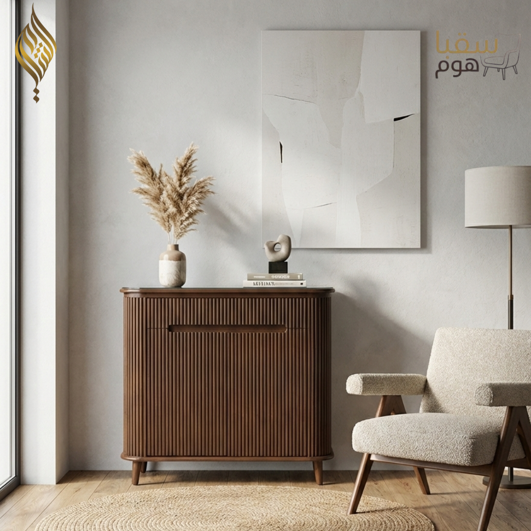 🪑 زاوية قراءة مثالية: كرسي “بوكلي” ناعم بجانب خزانة أنيقة، ليخلق لك ركنك الخاص للقراءة أو التأمل.
