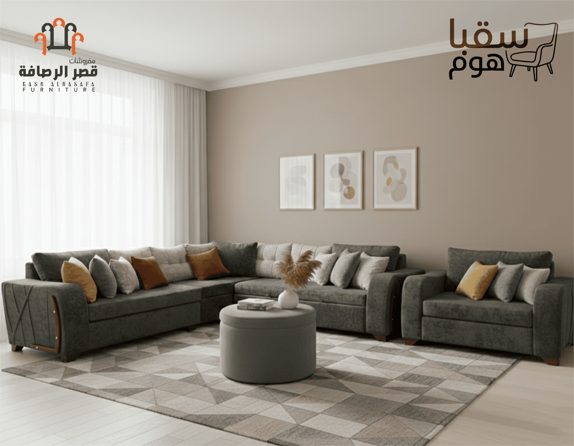وسائد ملونة حيوية: مجموعة متنوعة من الوسائد بألوان دافئة (الخردلي، البرتقالي المحروق، الرمادي، الكريم) تضفي لمسة حيوية وشبابية على التصميم