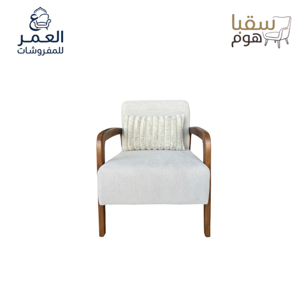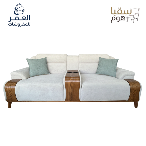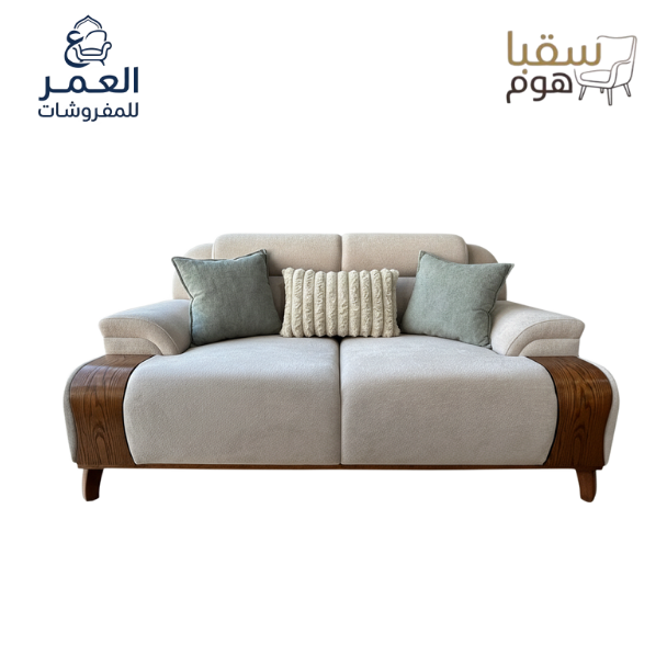 • تصميم مستوحى من الطبيعة: مزيج رائع بين لمسات الخشب الطبيعي الدافئ (على الأذرع والأرجل) والأقمشة البيج الناعمة، مع لمسات حيوية من وسائد “أخضر الميرمية” الهادئ.