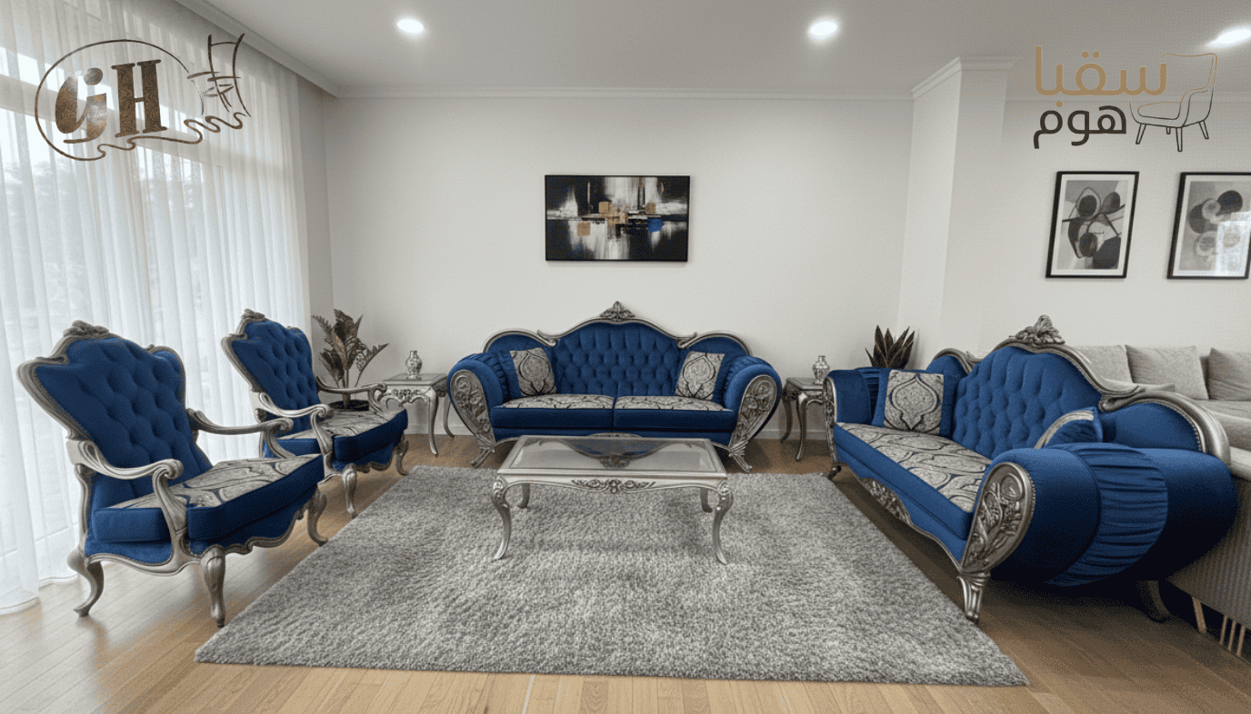 طقم صالون يجسّد الفخامة الكلاسيكية بلمسة عصرية، يجمع بين اللون الأزرق الملكي العميق والإطارات الفضية المنحوتة بدقة عالية. تنجيد فاخر بتفاصيل مطرزة يمنح راحة استثنائية وأناقة لافتة، مع تصميم متناسق يرفع من قيمة أي مساحة استقبال.